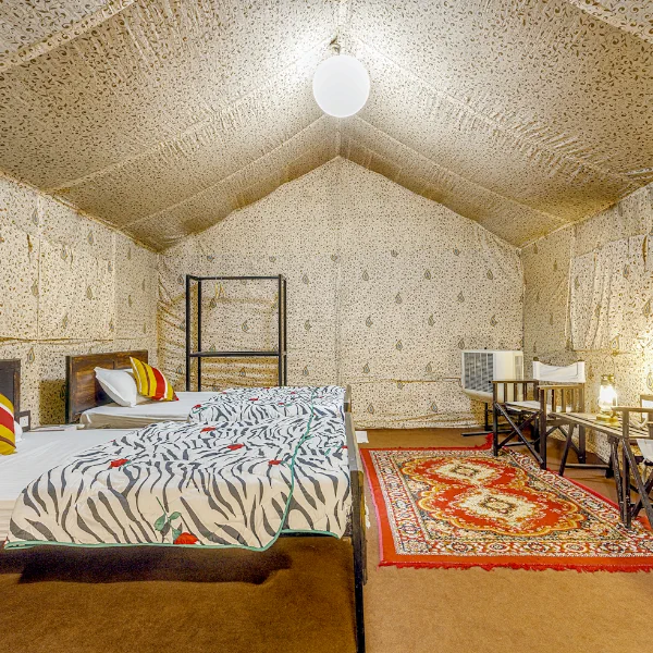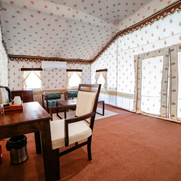 Find comfort enveloped in charm with our Deluxe AC Swiss Cottage, equipped with a snug sitting area, luxury amenities, and twin beds.