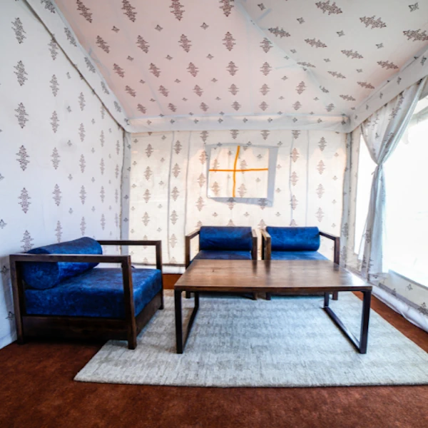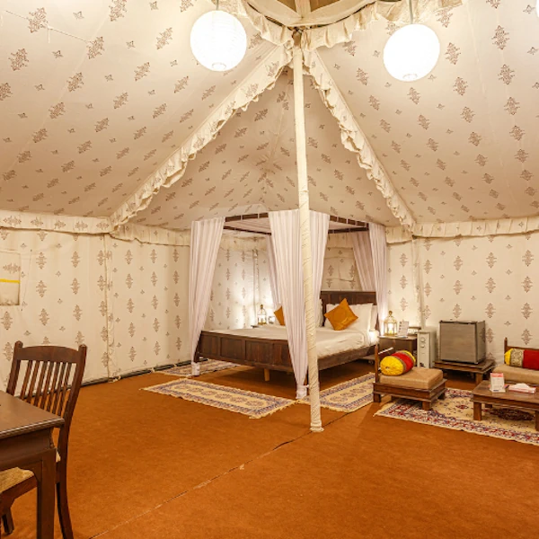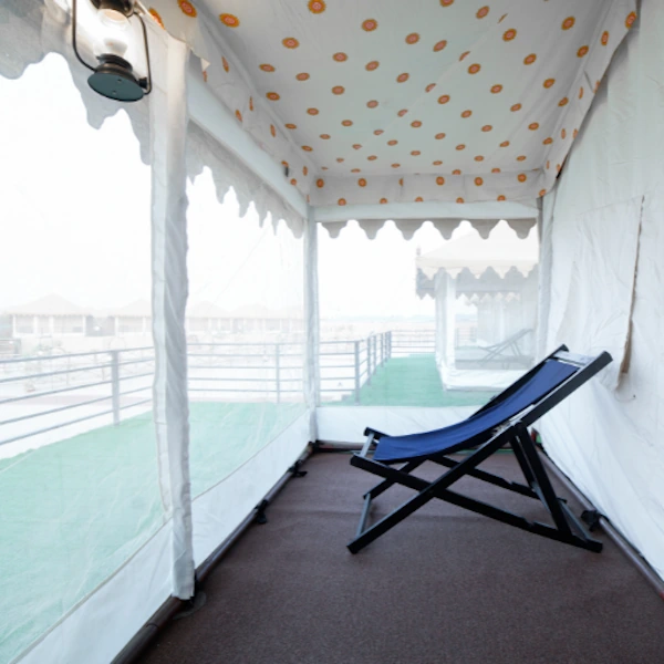 Our Premium Tent, designed with attention to detail, houses a cosy sitting area alongside a comfortable double bed. Enjoy the luxury amenities inside, or relax by sitting on the spacious front porch.