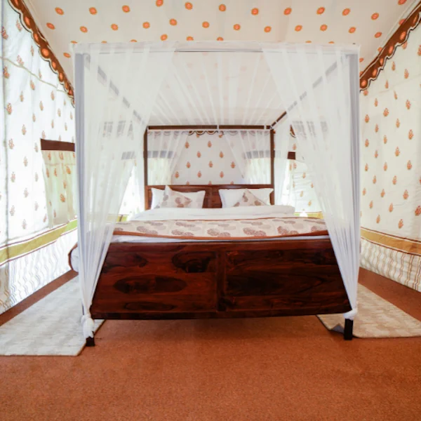 Experience regal luxury in our Rajwadi Suite. This expansive suite features a master bedroom, an adjoining dressing room, and a sophisticated living space equipped with a royal sofa set.